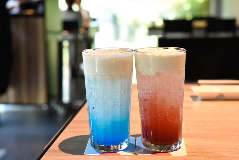 套餐飲品有炭焙烏梅汁、無糖茶花綠茶可暢飲、還有雪碧及可樂,加$38可升級其他飲品。我們現場掃描QRCODE加入會員取得飲品升級券,換了漸層美麗的富士山晴空泡泡飲、粉紅火山莓果泡泡飲,這兩款飲品是調味氣泡冰沙蓋上奶泡,組合有趣但稍甜了點。