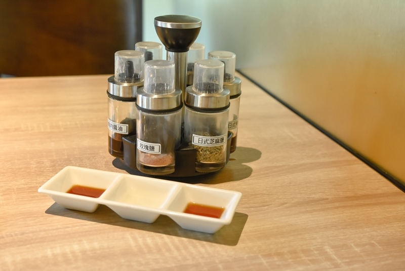 服務員首先送上裝在壺裡的昆布高湯,由於天熱我們也只喝了一碗。桌上擺著多種調味料分別是燒肉醬油、日式照燒醬、檸檬汁、玫瑰鹽、胡椒及日式芝麻鹽,我取用了前三種,醬料味道偏淡不會蓋過肉品原味還不錯。