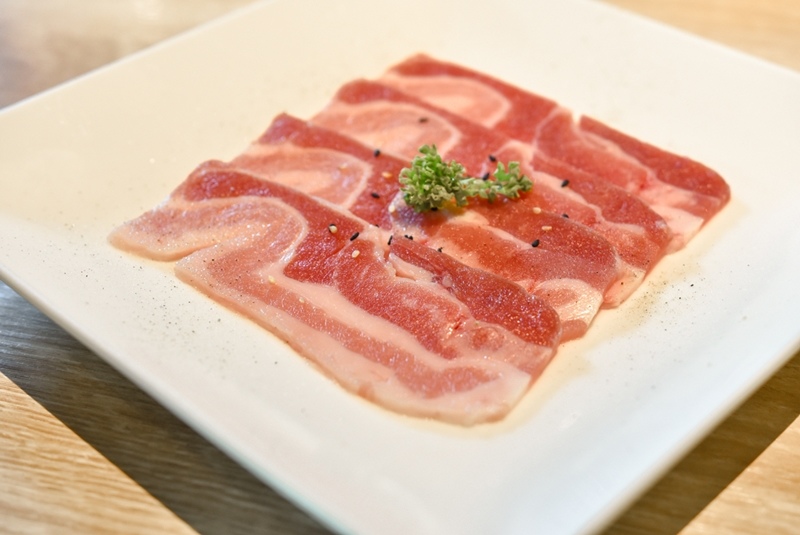 先上了大腹牛、優酪豚五花、豚梅花及雞腿肉,發現和菜單略有不同詢問服務員始知部分品項調整,未事先告知客人是服務上小小的美中不足,此外在招呼、換烤網到額外招待都非常貼心。第一輪的四種肉品口感都還不錯,特別喜歡油脂豐富的優酪豚五花和雞腿肉。而蔬菜有新鮮生菜葉與野菜盛合可選,懶得烤蔬菜而選擇可以包肉食用的菜葉,看到送上一大球顆萵苣時其實有點驚訝XD